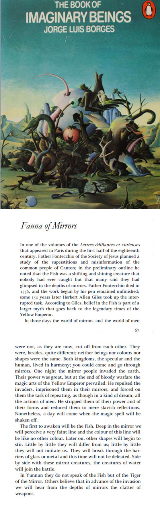 Borges was terrified of mirrors because he feared the duplicate might take over—the movie Multiplicity is basically his worst nightmare realized. I love myths that recontextualize everyday things and simultaneously define the thing and add new, highly imaginative elements. I became obsessed with mirrors once I noticed our cat sitting in front of a mirror and looking into the reflected room as if it were real while not giving any credence to its reflected self. Mirrors have become overused all over the place, like in horror movies where broken shards will reflect different aspects of a psychotic person’s personality, so finding new ways to interact with a common object is always invigorating.