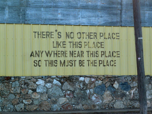 eteam’s ongoing installation, Montello International Airport indicating a possible gestural map, though I feel the complications of it as _site _and I wonder at the condition of loss that travel negotiates. Fugue state – against the emblem of mass travel? Amnesia as disappearance of and into facilitation of legible plot? The materiality of the abandoned object and the construction of habitation appear in this piece in such a way that it has a real effect – one _can _land an airplane, in a way that the Prada store in Marfa was just another colonial beacon, building an opera house in the jungle, exporting democracy, etc. If the American avant garde has become a jewel shop per Heriberto Yepez, it’s only right that the Prada store in Marfa was almost immediately broken into. In Texola, Oklahoma, a town that didn’t refuse to die, two adjacent sides of a building : “No Place Like Texola” / “There’s No Other Place / Like This Place / Anywhere Near This Place / So This Must Be the Place.”