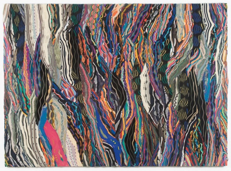 In order to be recognized as a painter, does one need to work, primarily, with paint? Or can “a painting” made out of Coogi sweaters still be considered a “cozy” thing? Embedded in Musson’s canvases is so much color, so much cognitive dissonance.