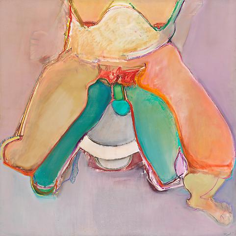 In this early painting, Semmel seizes the image (it’s her signature move) and makes a melee of it, all but squashing that cucumber colored cock. By leaving the hands outside the frame, she frames their intent, their desire: the painterly (pornographic?) moment of capture.