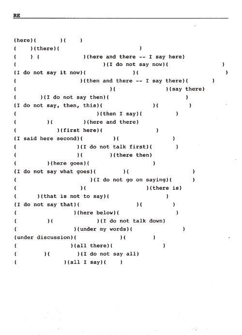 Parentheses allow me to retreat from myself, as well as say something else. For whom are such secret missives intended? Whoever is listening, I guess. When I’m writing, opposite me, there’s always at least two people: somebody (an abstraction) sitting next to your ghost.