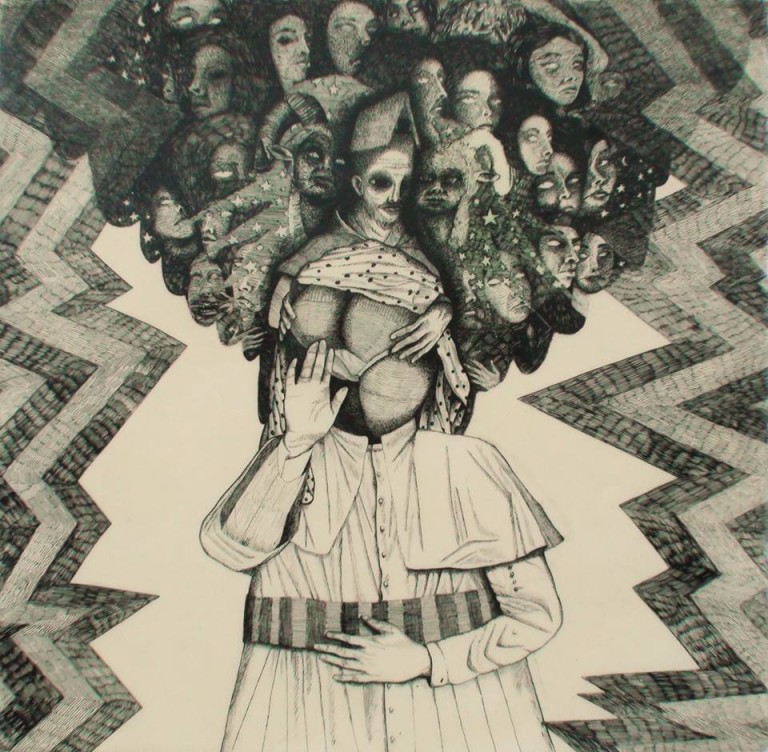 NOÛS SOMMES Jesus crowdsurfing on a bedsheet suspended by angels, intestines uncoiling; an angel wedding a healer by eating his arm over an unidentifiable female body; the pope holding his hand up to his face which is an ass in transparent underwear leading a constellation, all of it in black and white and shades of grey. #joiesauvage #amnésie #éternalretour (Sandra Ghosn, NOUS-SOMMES)